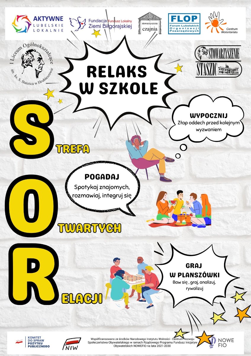 Przypomnijmy, że inicjatorem powstania SOR’u jest grupa nauczycielek naszej szkoły wspierana przez Stowarzyszenie „Staszic”. Projekt dofinansowany został przez Stowarzyszenie „Czajnia” realizującym Projekt „Aktywne Lubelskie Lokalnie” przy współpracy z Funduszem Lokalnym Ziemi Biłgorajskiej, Związkiem Stowarzyszeń Forum Lubelskich Organizacji Pozarządowych oraz Stowarzyszeniem Centrum Wolontariatu w Lublinie. Całość wydatków to 6600 zł, z czego 6000 zł to kwota dofinansowania, a 600 zł to wkład własny Stowarzyszenia „Staszic”. Projekt sfinansowano przez Narodowy Instytut Wolności - Centrum Rozwoju Społeczeństwa Obywatelskiego ze środków Funduszu Inicjatyw Obywatelskich na lata 2021-2030.