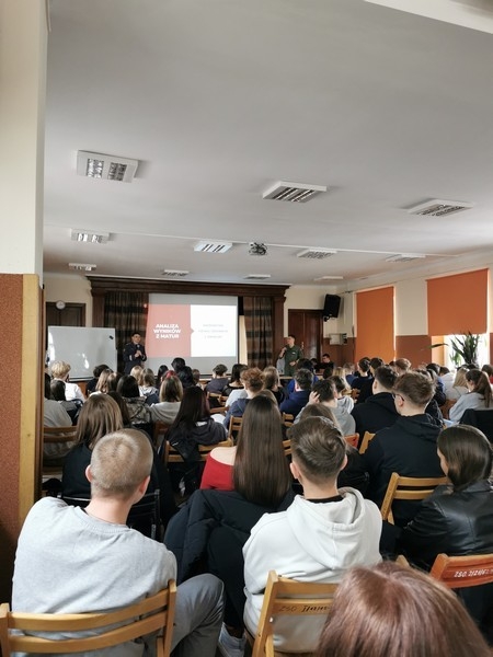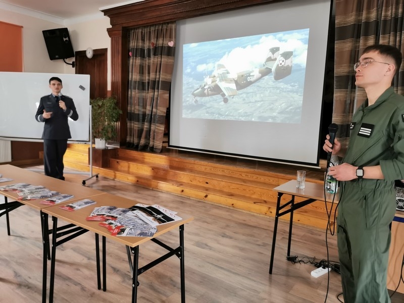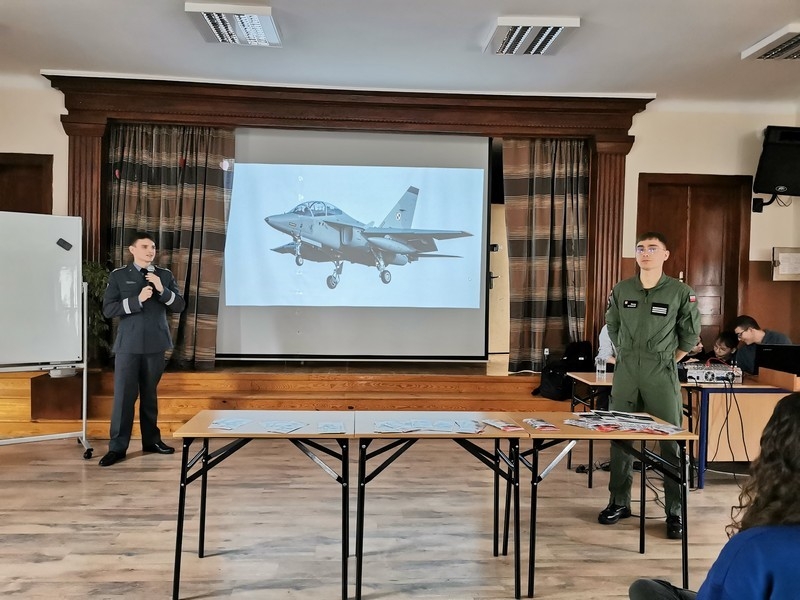 14. 03. 2025 r. młodzież I Liceum Ogólnokształcącego im. ks. Stanisława Staszica w Hrubieszowie spotkała się z absolwentami naszej szkoły, a obecnie studentami III roku Lotniczej Akademii Wojskowej w Dęblinie, st. kpr. pchor. Jakubem Drączkowskim i st. kpr. pchor. Maciejem Nowackim.
