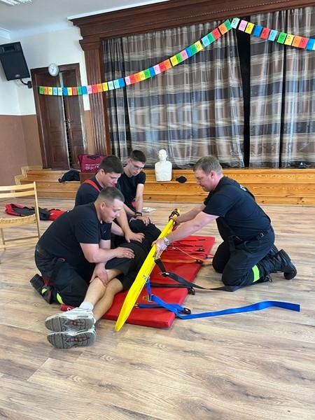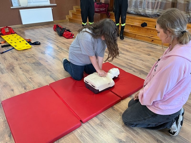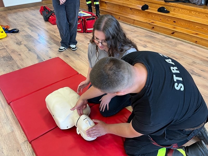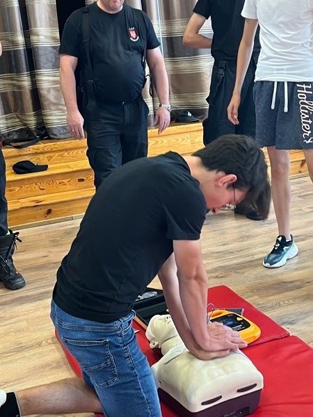Tuż przed wakacjami odbyło się bardzo wartościowe spotkanie z przedstawicielami Ochotniczej Straży Pożarnej w Hrubieszowie, podczas którego uczniowie uczestniczyli w praktycznych zajęciach z pierwszej pomocy. Przypomnieli sobie zasady RKO na fantomach, układanie poszkodowanego w pozycji bocznej ustalonej, a także praktycznie zastosowali zasady resuscytacji krążeniowo-oddechowej, korzystając ze szkolnego defibrylatora treningowego.