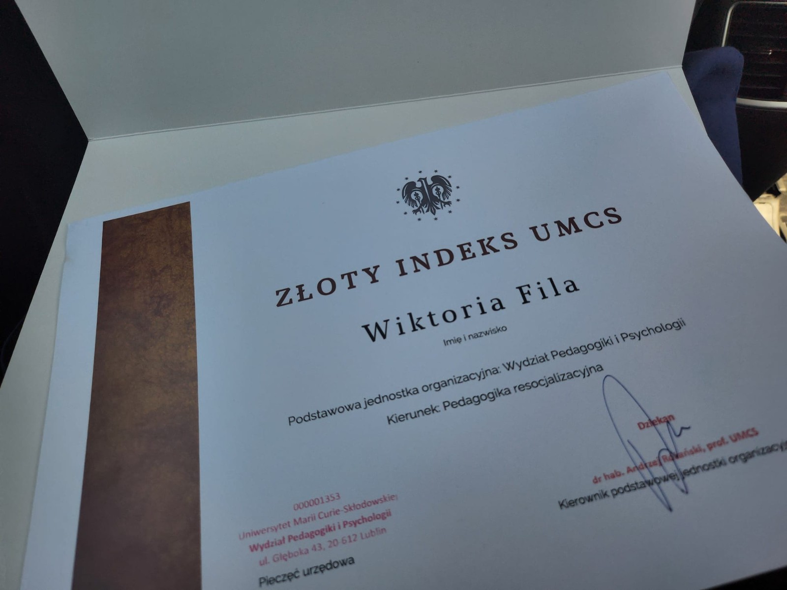 Uczennica p. Beaty Trześniowskiej, WIKTORIA FILA, która już w kwietniu zdobyła tytuł laureata Ogólnopolskiego Konkursu "Złote Indeksy Wydziału Pedagogiki i Psychologii", odebrała indeks z rąk dziekana Wydziału Pedagogiki i Psychologii dr hab. Andrzeja Różańskiego. Wiktoria już może być studentką Wydziału Pedagogiki Resocjalizacyjnej - wystarczy tylko zdać maturę - gdyż uczennica skończyła dopiero trzecią klasę.