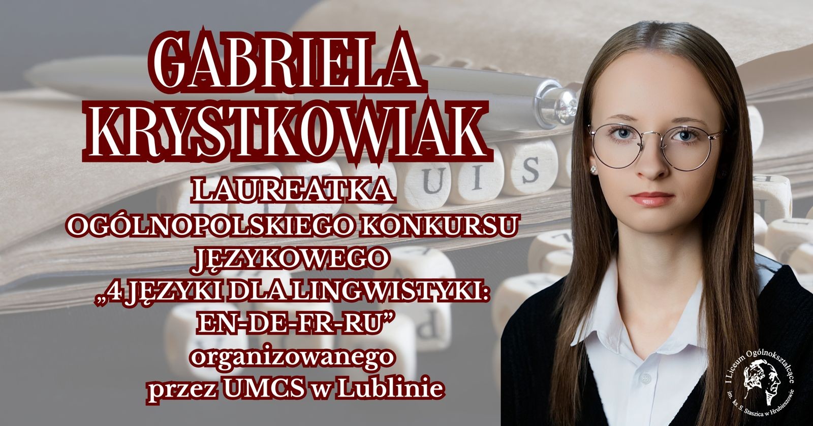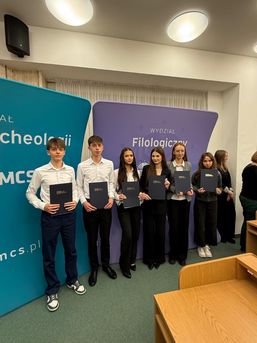 Rywalizacja o indeks Lingwistyki Stosowanej rozpoczęła się już 30.10.2025 r. podczas I etapu konkursu, do którego zgłosiło się około 300 uczniów z kilkunastu szkół średnich w kraju, a wśród nich 21 uczniów naszej szkoły grupy niemiecko-angielskiej i 22 z grupy rosyjsko-angielskiej. Do II etapu zakwalifikowano 99 uczniów. Grono finalistów wyłoniło się w trzecim etapie konkursu, który odbył się 14.03.2026 r. Rozgrywki finałowe składały się z części pisemnej i ustnej z dwóch języków. Największą wiedzą i umiejętnościami językowymi spośród wszystkich uczestników wykazała się Gabriela Krystkowiak z klasy 4D, uczennica p. Katarzyny Dziumagi – język niemiecki. Gabriela otrzymała zasłużoną nagrodę, jaką jest indeks na Lingwistykę Stosowaną UMCS. To wyjątkowe osiągnięcie jest dowodem jej ciężkiej pracy, zaangażowania oraz pasji do nauki języków obcych.