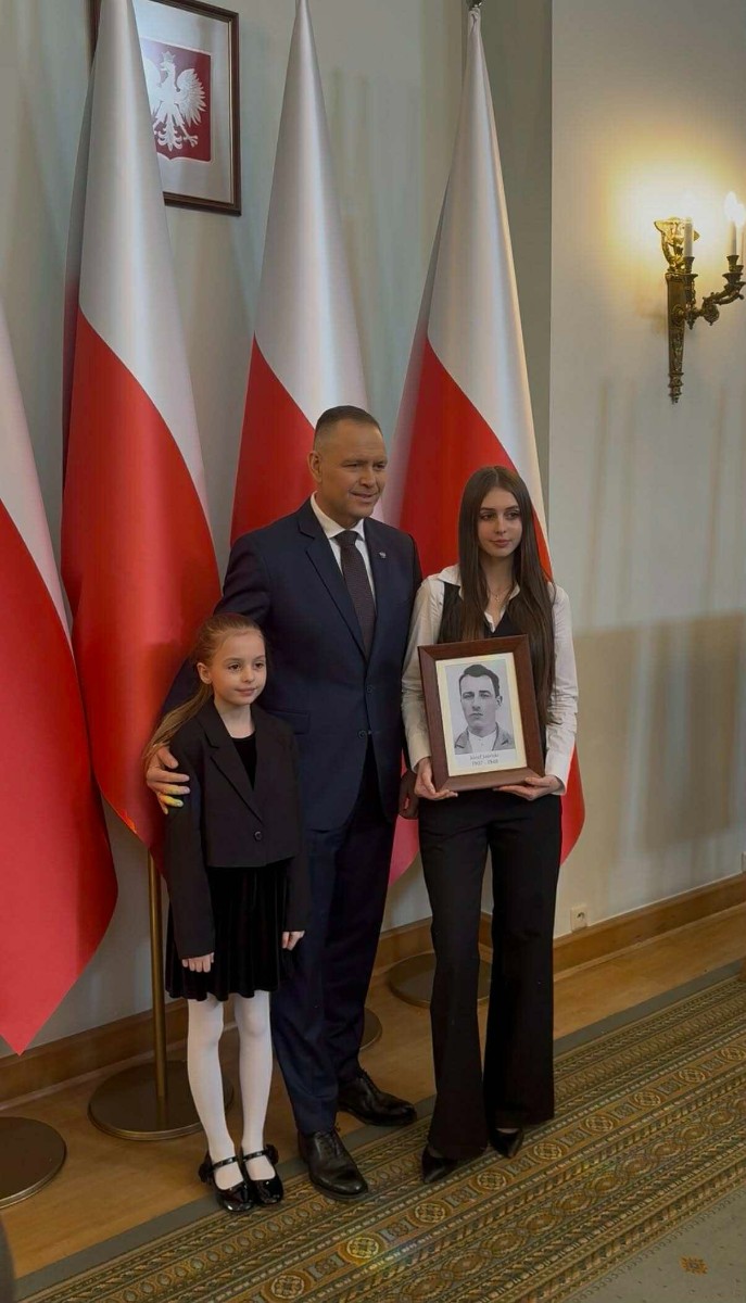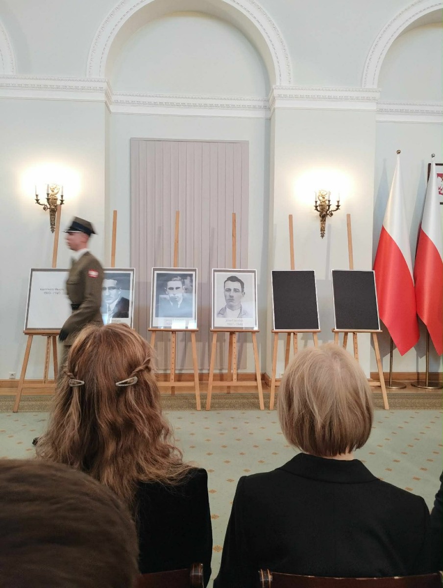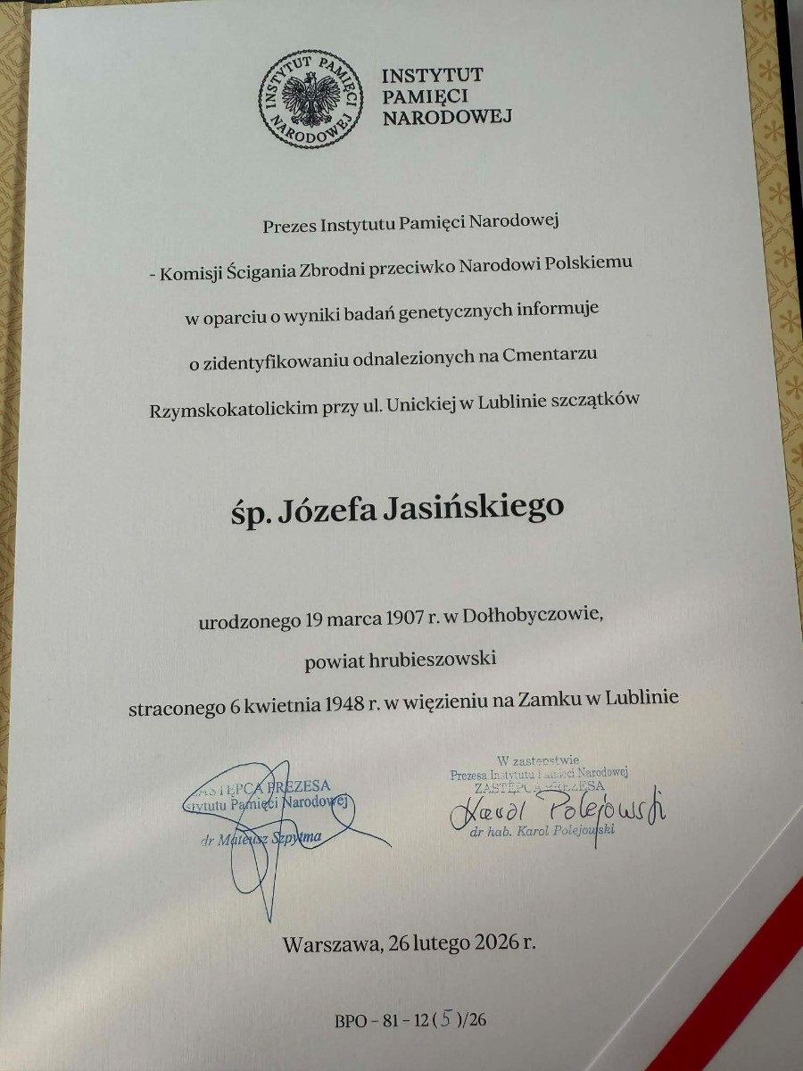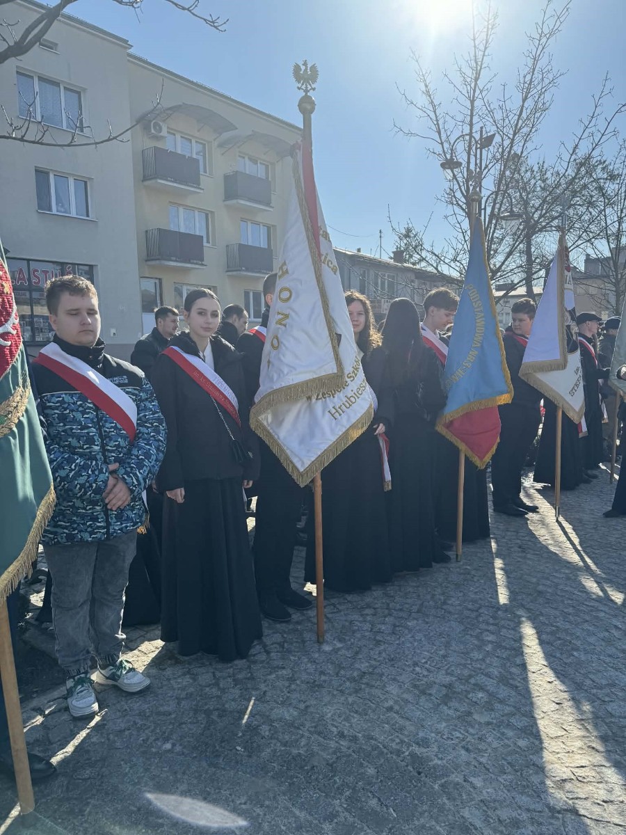 W hrubieszowskich obchodach I LO im. ks. Stanisława Staszica reprezentował poczet sztandarowy w składzie: Karolina Jasińska (III B), Oliwia Mączka (III A), Piotr Koroński (III A), pod opieką p. Joanny Pudłowskiej. Szkoła o ponad 100-letniej historii dba o przekazywanie uczniom wartości patriotycznych nie tylko w kontekście ogólnonarodowym, ale także tym lokalnym, dotyczącym miejsc, w których młodzież wzrasta i dojrzewa na co dzień. Członkini pocztu, Karolina Jasińska jest prawnuczką jednej z ofiar totalitaryzmu, Józefa Jasińskiego. 26 lutego 2026 r. wraz z rodziną wzięła udział w uroczystości w Pałacu Prezydenckim, w czasie której członkowie rodzin ofiar totalitaryzmów odebrali z rąk Prezydenta RP Karola Nawrockiego dokumenty potwierdzające tożsamość ich bliskich. Zapewne w wielu rodzinach naszych uczniów kultywuje się pamięć o cichych bohaterach trudnej polskiej historii. Nasze babcie, prababcie, dziadkowie i pradziadkowie to niejednokrotnie ludzie ogromnej odwagi, o czym musimy stale pamiętać, również dzięki takim świętom jak dzisiejsze.