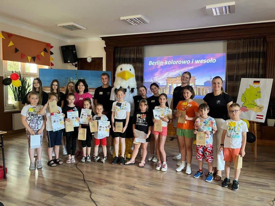 Nauczyliśmy się przedstawiać po niemiecku, a słuchając piosenek poznaliśmy nazwy kolorów. Zabawy było co niemiara, ale i rywalizowaliśmy ze sobą w quizach i konkursach (puzzle z mapą Niemiec, zgadywanka kolorów, malowanki). Najlepsi, a liczyła się nie tylko poprawność odpowiedzi, ale i szybkość, otrzymali od Staśka nagrody specjalne. Pozostali, bo nie było przegranych, otrzymali za swoje zaangażowanie i poprawne odpowiedzi drobne upominki, naklejki i słodycze.