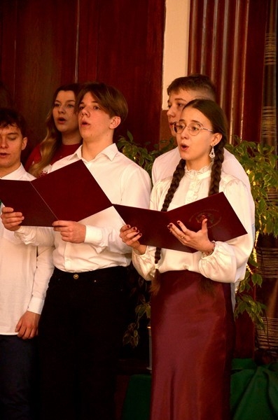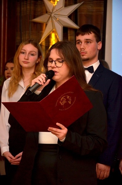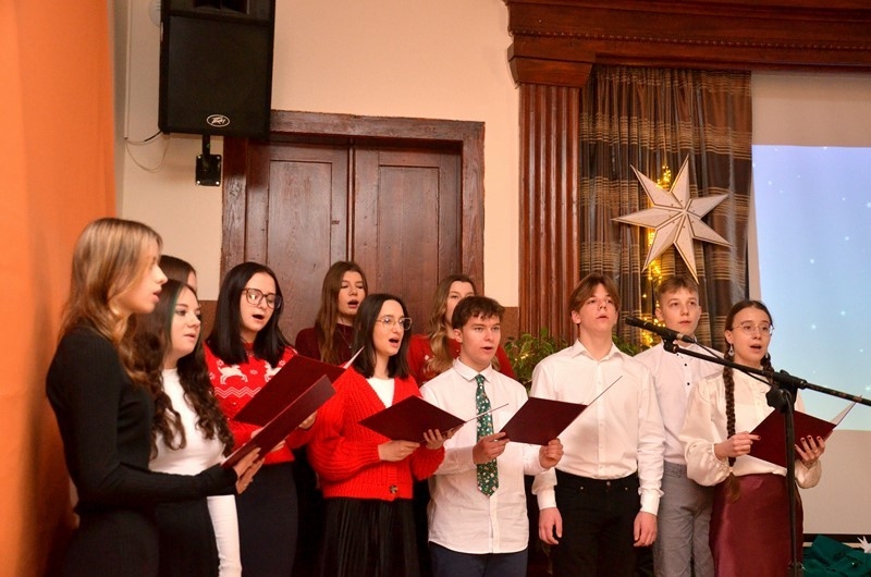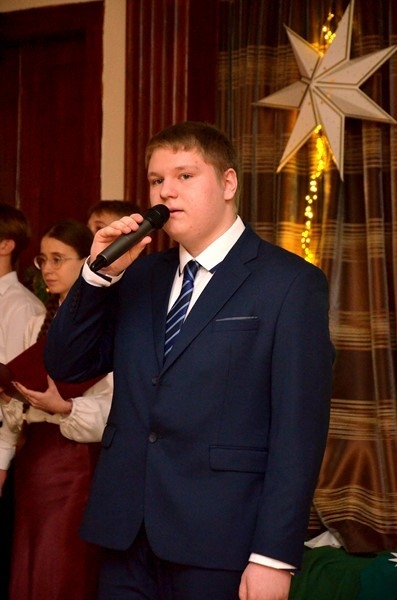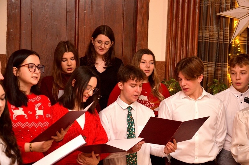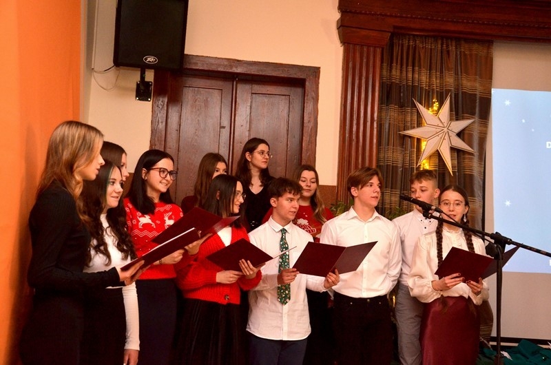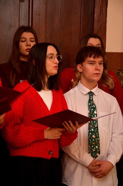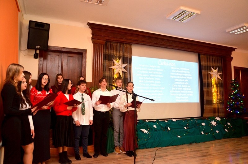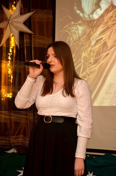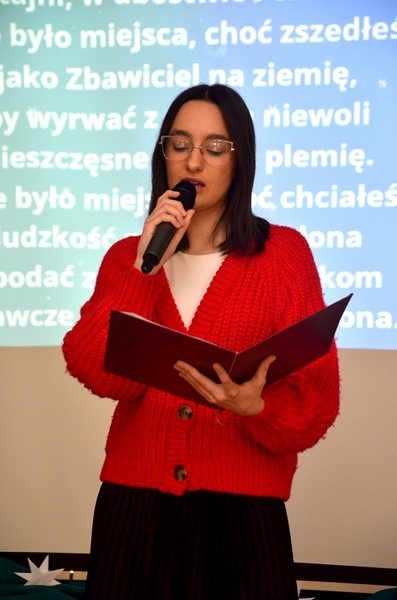 Piękna deklamacja wierszy i wspólny śpiew kolęd wprowadził wszystkich w świąteczny nastrój. Kolędy i pastorałki śpiewane przez młodzież oraz słowa, które wybrzmiały w przedstawieniu uświadomiły młodym, dlaczego co roku z taką dziecinną ufnością czekamy właśnie na ten czas. Na zakończenie głos zabrała Pani Dyrektor, która podziękowała artystom i wszystkim zaangażowanym w przygotowanie tego przedstawienia oraz złożyła zebranym życzenia bożonarodzeniowe.