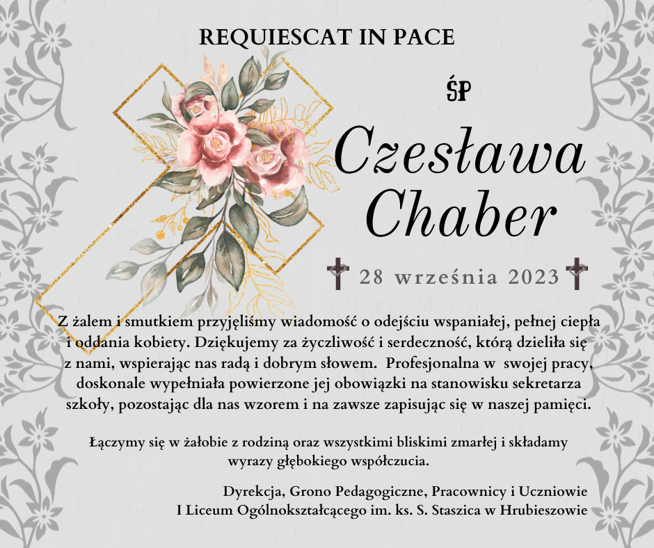 Z głębokim żalem zawiadamiamy, że zmarła Czesława Chaber
