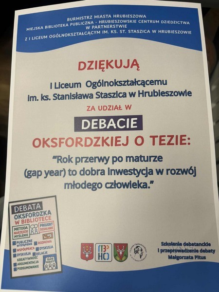 7 listopada 2025r. w Miejskiej Bibliotece Publicznej - Hrubieszowskim Centrum Dziedzictwa im. Krystyny i Stefana Du Chateau w Hrubieszowie odbyła się debata oksfordzka z udziałem uczniów naszej szkoły.