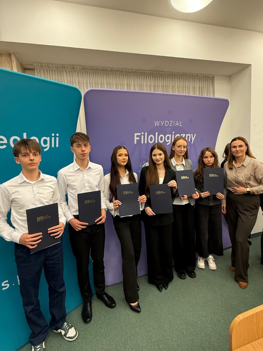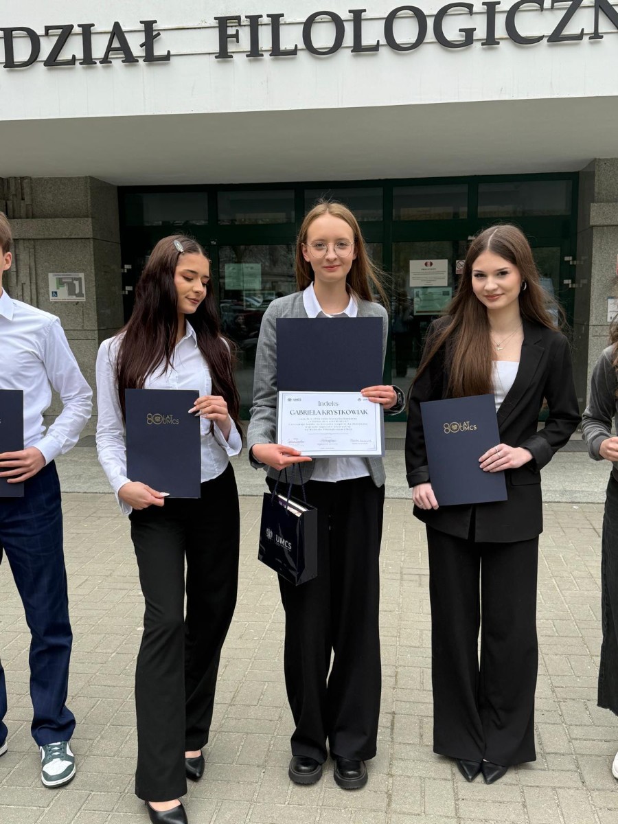 Rywalizacja o indeks Lingwistyki Stosowanej rozpoczęła się już 30.10.2025 r. podczas I etapu konkursu, do którego zgłosiło się około 300 uczniów z kilkunastu szkół średnich w kraju, a wśród nich 21 uczniów naszej szkoły grupy niemiecko-angielskiej i 22 z grupy rosyjsko-angielskiej. Do II etapu zakwalifikowano 99 uczniów. Grono finalistów wyłoniło się w trzecim etapie konkursu, który odbył się 14.03.2026 r. Rozgrywki finałowe składały się z części pisemnej i ustnej z dwóch języków. Największą wiedzą i umiejętnościami językowymi spośród wszystkich uczestników wykazała się Gabriela Krystkowiak z klasy 4D, uczennica p. Katarzyny Dziumagi – język niemiecki. Gabriela otrzymała zasłużoną nagrodę, jaką jest indeks na Lingwistykę Stosowaną UMCS. To wyjątkowe osiągnięcie jest dowodem jej ciężkiej pracy, zaangażowania oraz pasji do nauki języków obcych.