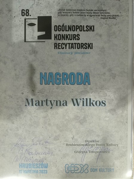 12.04.2023 r. w Hrubieszowskim Domu Kultury odbyły się eliminacje powiatowe do 68 Ogólnopolskiego Konkursu Recytatorskiego. W turnieju recytatorskim udział wzięły: Zofia Śliwa z klasy I a, Agnieszka Pęk z klasy I f, Aleksandra Szymko i Martyna Wilkos obie z klasy II e. Nagrody zdobyły: Zofia Śliwa z klasy I a - uczennica pani Doroty Sędłak oraz Martyna Wilkos z klasy II e - uczennica pani Beaty Trześniowskiej.